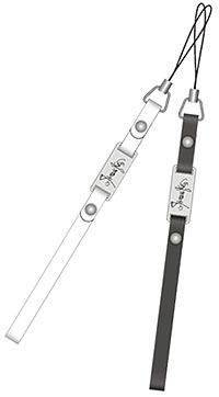 | 黑色/白色真皮軟質手機吊鍊, 搭配烙有陳珊妮親筆簽名白鋼色金屬版, 高貴實用值得珍藏。 |